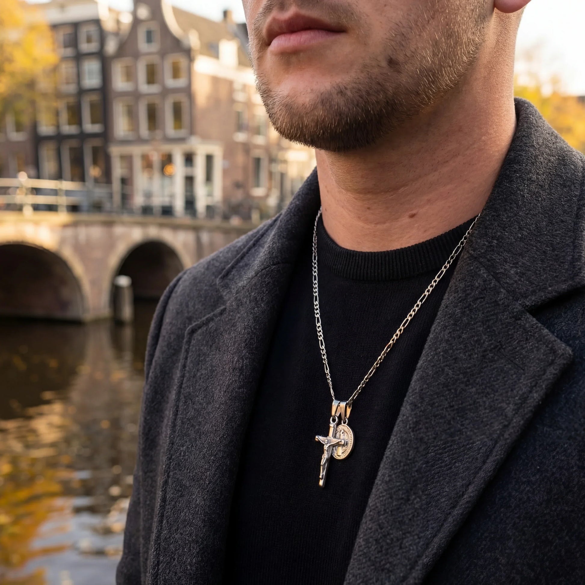Deze ketting combineert twee sterke symbolen: een gedetailleerd cross en een medaillon van Maria. Samen staan ze voor bescherming, kracht en zegen in elke situatie.