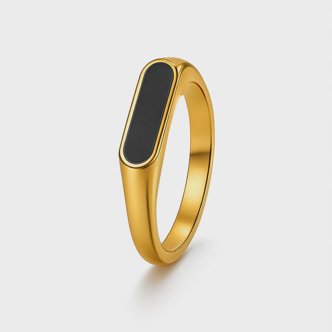 Met een gladde onyx steen, valt deze ring direct op. De beschermende coating houdt 'm lang mooi. Draag ‘m alleen of samen met andere ringen dit is een tijdloos stuk dat altijd werkt.
